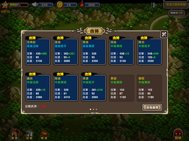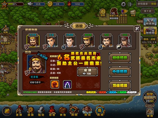 遊戲中,三國武將都會配合歷史上的經典戰役而逐一登場,玩家可要看准時機,把心儀的謀臣智鬥、勇將虎威收歸麾下,盡享全屏大技的無盡快感!