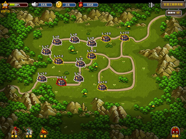 武將可按照初級→中級→高級→頂級的順序晉級。每次晉級需要一定的等級要求,並消耗一定的功勳,功勳可通過群英戰地圖通關獲得。越高級武將的屬性和能力越高。而武將等級決定防禦塔的級別,武將晉級後,可以對該武將的防禦塔進行升級。
