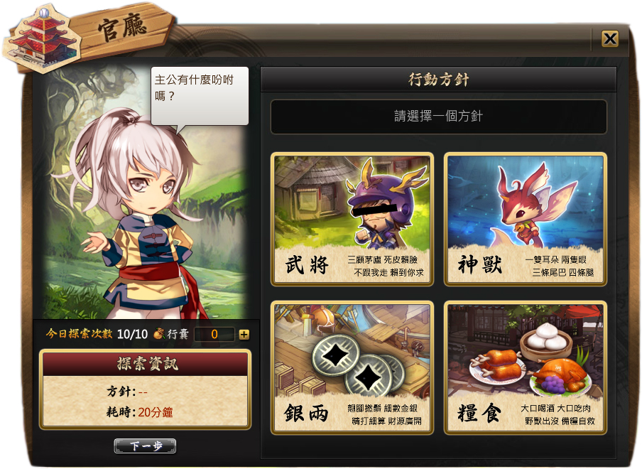 武將、神獸、銀兩及糧食,共四種行動方針,任君選擇。