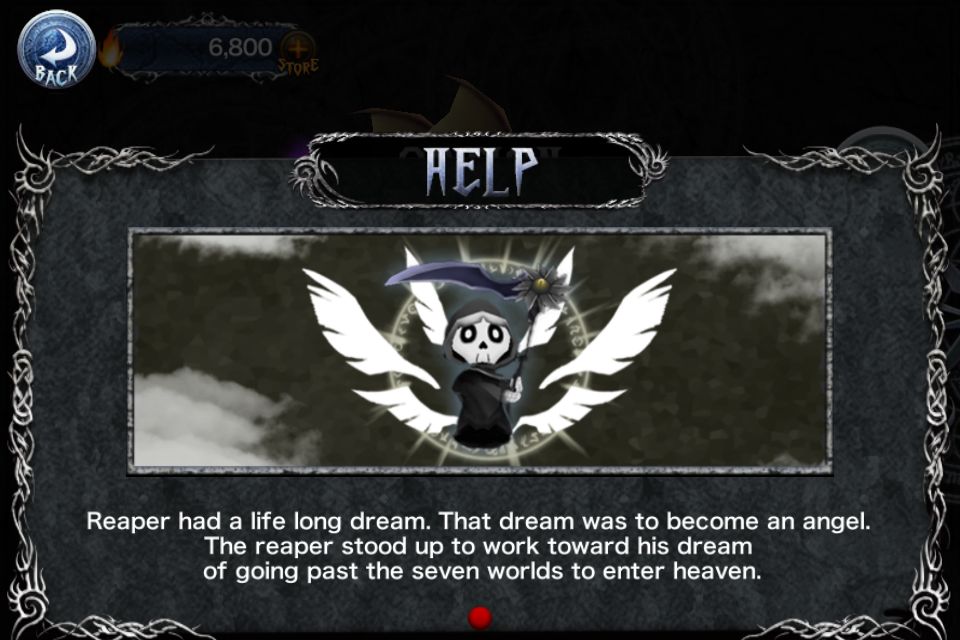 遊戲中玩家操作的可愛死神,為了想要進入天堂變成天使,因此決定要通過七大世界前往天堂。遊戲的操作採用了雙軸的方式,左手控制人物的移動,右手則是控制人物的射擊及特殊技能的使用。戰鬥時玩家要一邊閃躲敵人的包圍和遠程射擊,一邊發射衝擊波消滅敵人。