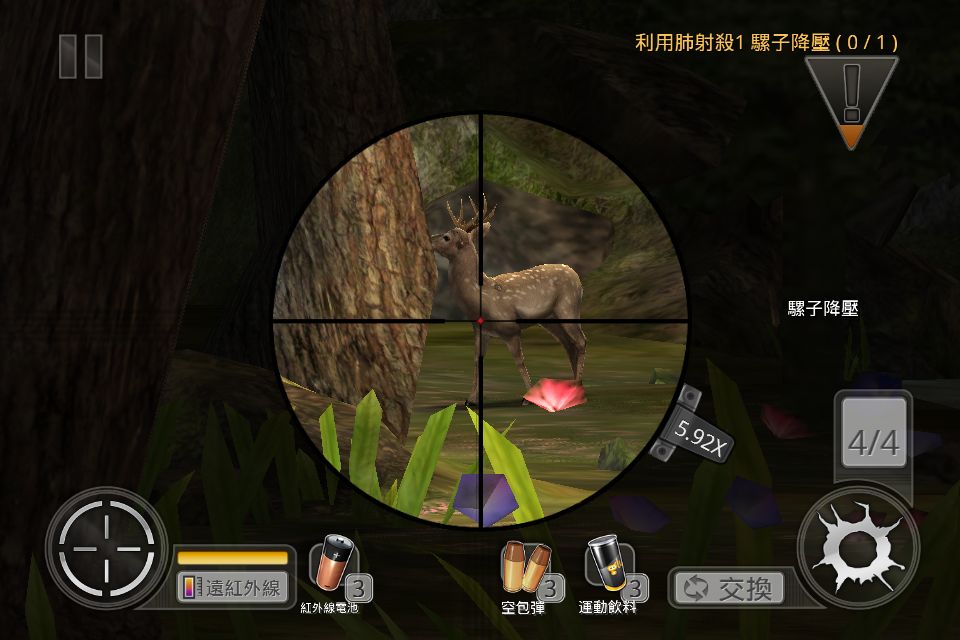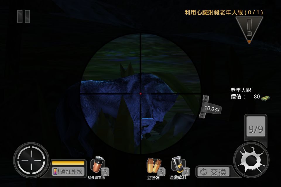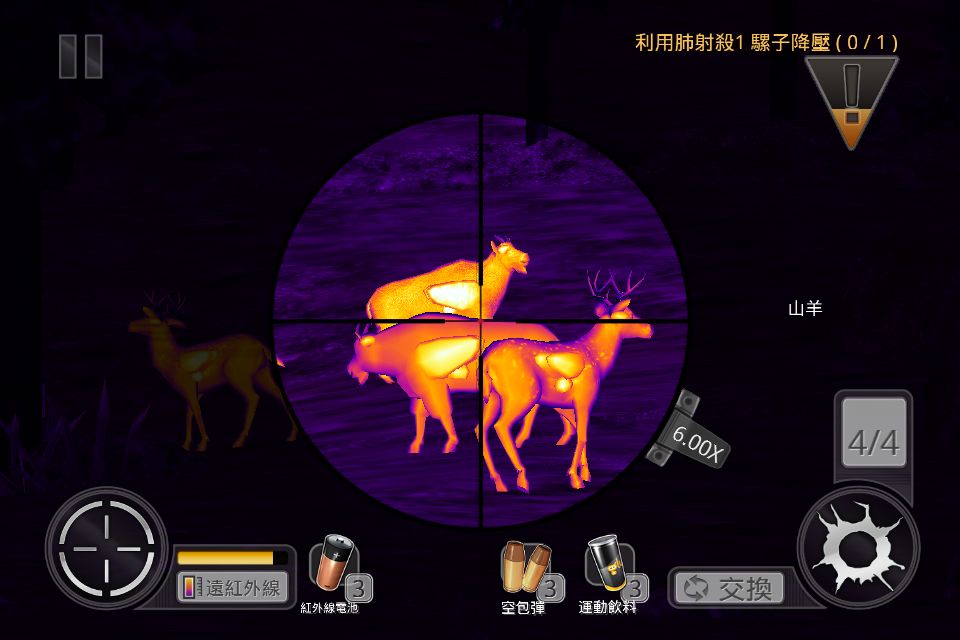 而狩獵時除了指定的目標之外,有時候也會指定要擊中心臟或是肺部才能夠過關,這時候就要開啟紅外線來透視獵物的器官位置,進行更精準的射擊。