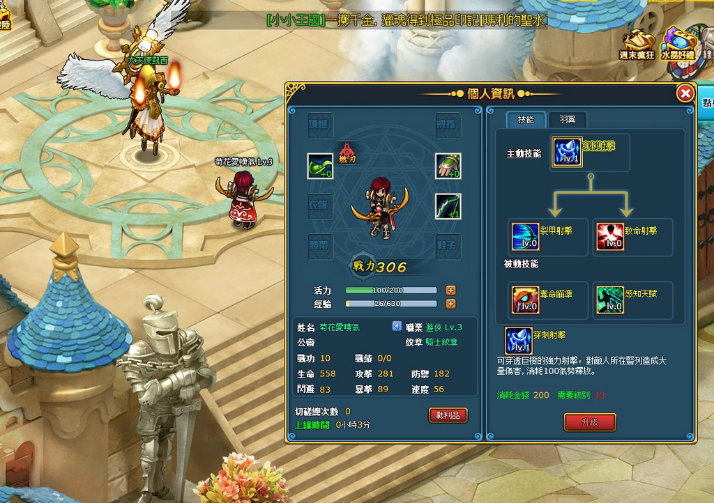 遊俠在遊戲中精通狙殺之道,主要技能為『穿刺射擊』,能夠貫穿直排敵人造成傷害,後期的進階技能『淬毒箭』能在貫穿敵人直排的同時有機率造成敵人破甲,『瞄準射擊』能在貫穿敵人時大幅提高爆擊機率,被動技能有增加閃避率的『感知風暴』和增加爆擊機率的『奪命瞄準』,讓遊俠成為遊戲中數一數二的狙擊大師,弦響命消。