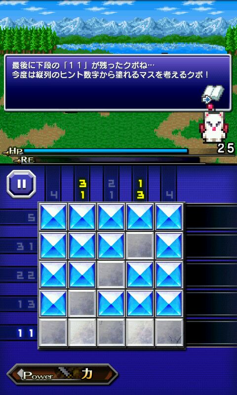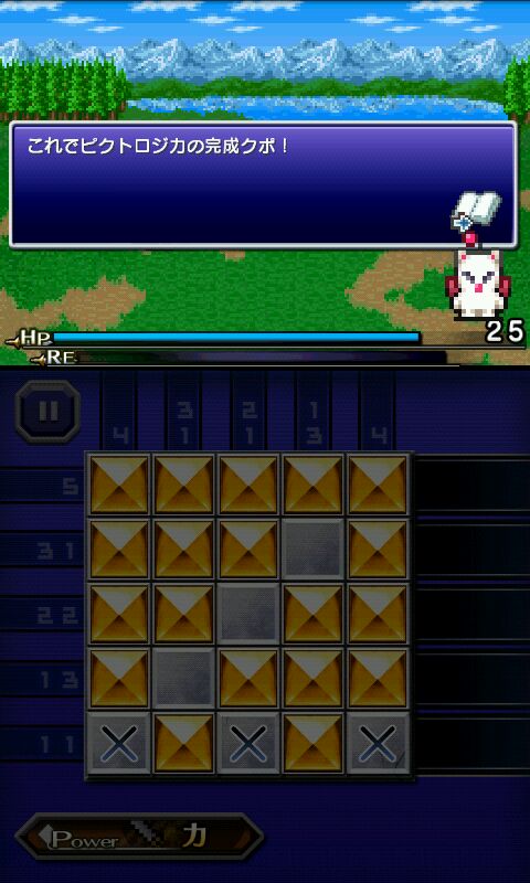 本作的戰鬥必須先解開在 5 X 5 的面板上所進行圖像邏輯益智遊戲,一開始雖然會感到複雜,但照著莫古里的解說玩的話,應該都能順利理解才對。