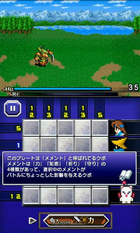 另外,在戰鬥畫面下方有個面板,在戰鬥開始時玩家可用觸碰來切換面板,面板的效果有四種,分別為力量/智慧/祈禱/守護。