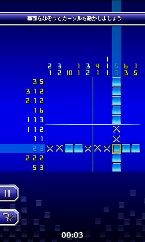 面板左側跟上方都有數字,畫面中左上在此先稱「橫一」,橫一數字為5的時候,代表橫一的5個空格都可填滿,橫二的「31」代表填滿3格後空一格再填1格,直一的4就代表連續填滿4格,以此類推。