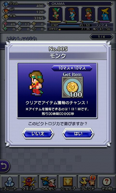 而 PICTLOGICA 就類似每日獎勵的系統,當你角色越多就能獲得越多獎勵,不過得通過另外一種益智遊戲才能取得,這個小遊戲跟戰鬥系統的益智遊戲差不多,但面積是 10 x 10,所以玩起來會有不同的感覺。