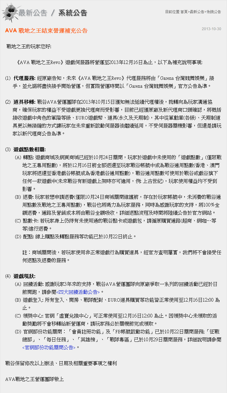 公告中同時說明了關於遊戲點數處理細則與遊戲營運現狀等資訊。