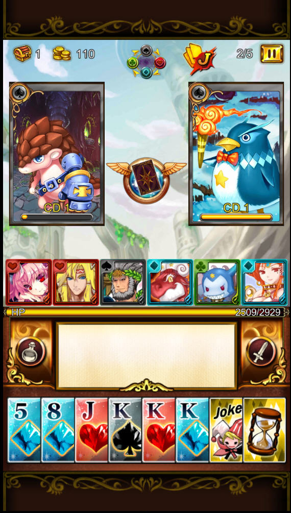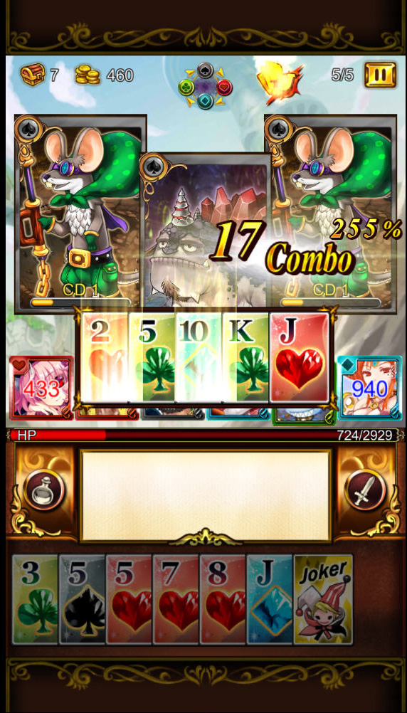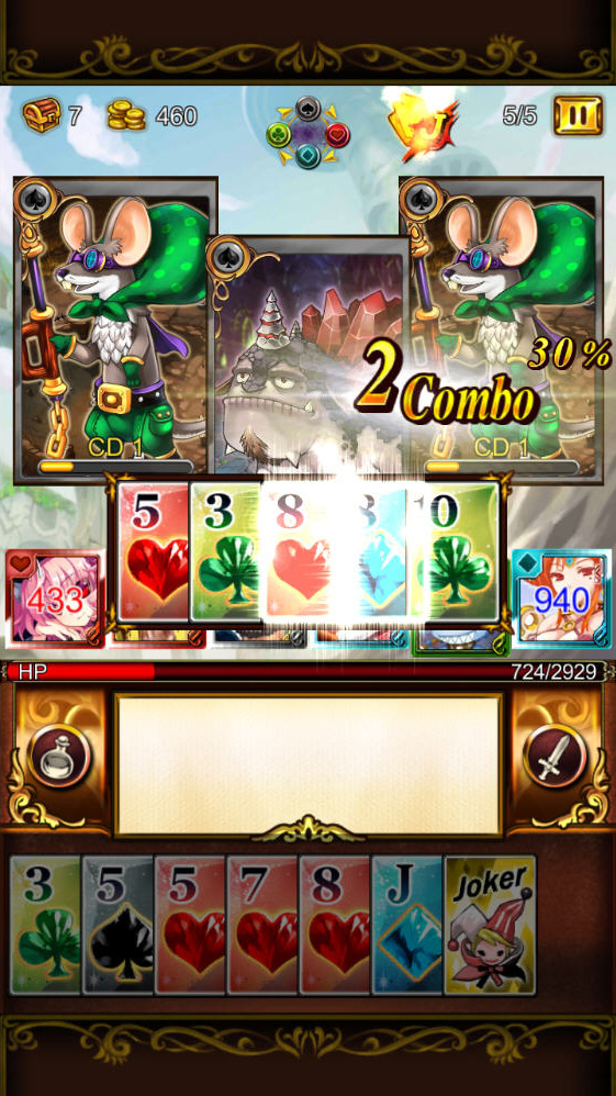 觸發 Combo 系統之後畫面中央將出現隨機五張牌,而如果五張牌中組成任一種牌型如一對、三條、順子、四支之類,那麼組成牌型的撲克牌即會消掉並轉成 Combo 數量,另外當 Combo 系統組成任一種牌型後,系統將會自動補牌到中央牌庫裡,如果補的牌也可組成牌型那麼Combo數就會持續累積,而當補牌到完全無法組成牌型後 Combo 即結束,同時會依最後的 Combo 數量來給予大量傷害或治療加成。