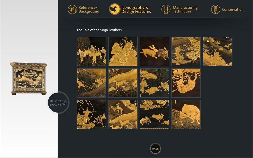 Mazarin Chest 3D 數位互動展品讓參觀者可以直接在大型觸控螢幕上,彈指間 360 度旋轉探索,將精彩細部甚至是實體展品所看不到的漆箱內面,透過虛擬的方式開啟並仔細賞玩。此外,還精心設計「 Learn More 學習模式」介面,參觀者可進一步深入了解《莫札林蒔繪漆箱》的所有流傳歷史、圖像研究、和古物修復等 V&A 博物館研究團隊歷時十年的心血結晶。