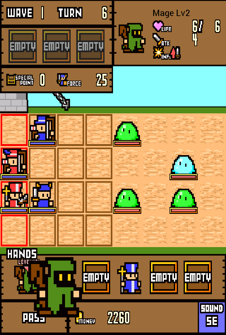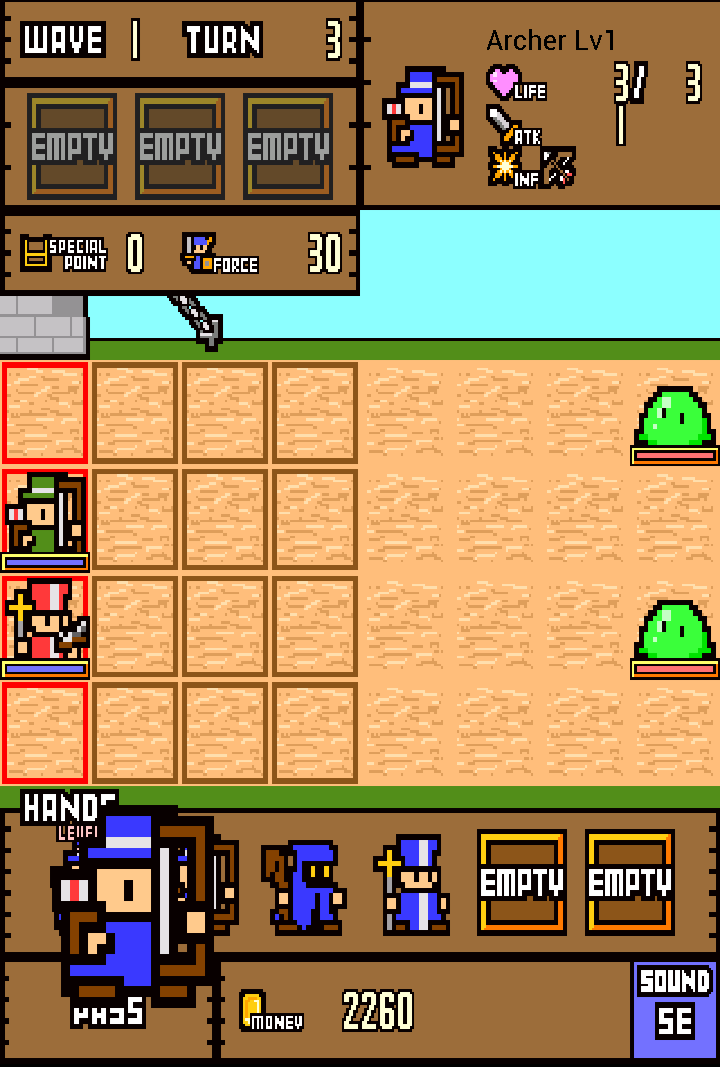 說到本作與一般塔防遊戲最顯著的差異,就在於回合制的玩法以及士兵的升級,而這也是本作的核心所在。首先,士兵升級必須依靠「融合」的方法,也就是讓兩個同等級、同職業的士兵合體成下一級的士兵。每一種士兵都有五個等級、並且從最低等級開始依序以藍、綠、紅、紫、金五種顏色來區分。