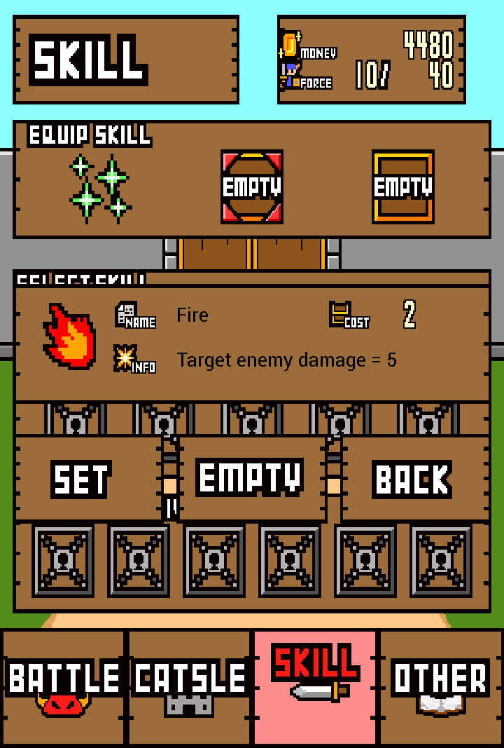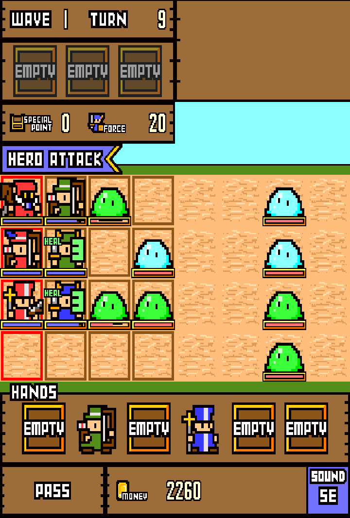在將怪物擊敗之後,怪物會掉落「寶箱」,只要將士兵移動至該格便可獲得,不過這個寶箱裡面可是甚麼也沒裝喔!隨著遊戲進行,玩家可以習得像是治癒術、火球術等各式各樣的技能,而這些寶箱正是發動技能所需的資源。