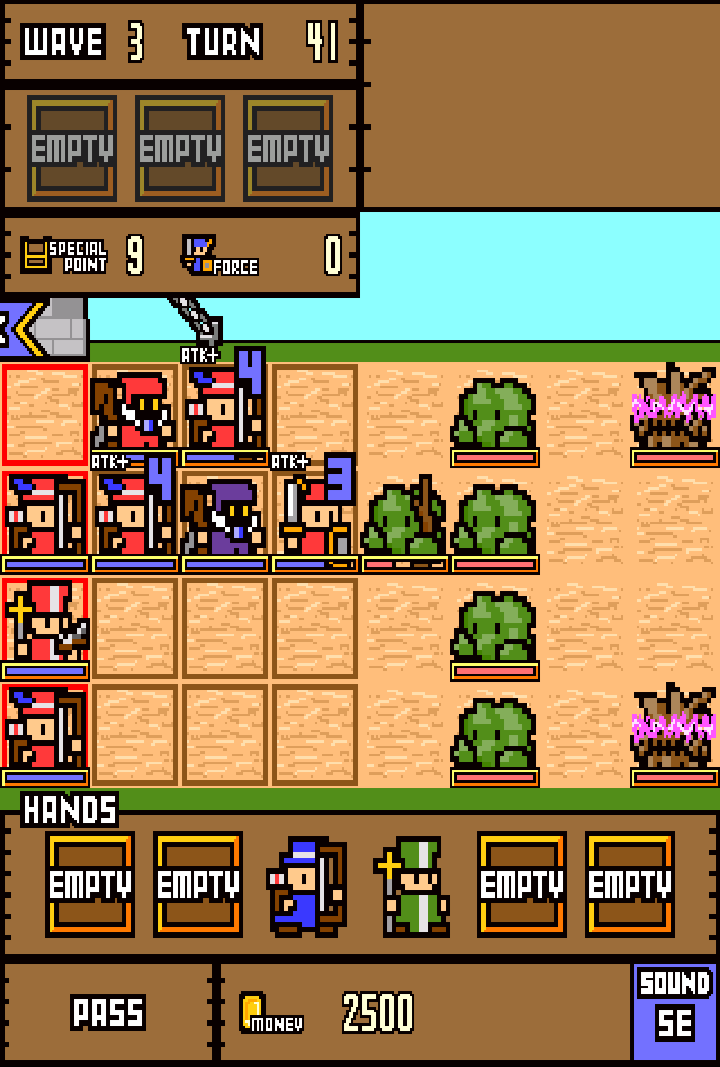 而說起回合的進行,其判斷條件則是「配置士兵」或是「移動場上的士兵」,也就是說,只要場上的配置更改、或是場上有人升級,便會使回合前進。不過換一個角度想,這也代表我們只要在待命士兵欄位中完成合體升級的動作,就不需要耗費一個回合啦!