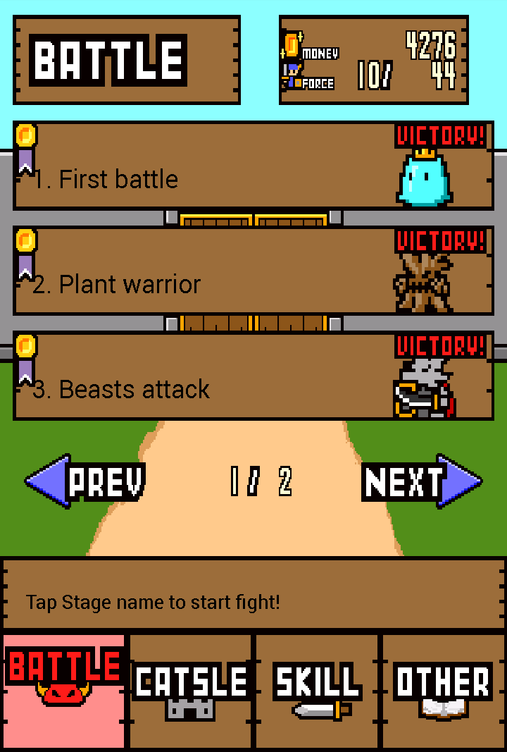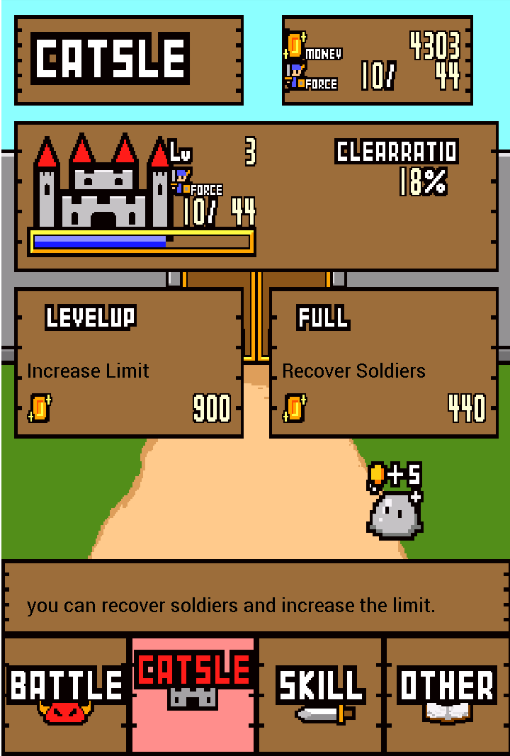 在這邊筆者發現了一個賺錢的小技巧,那就是在城堡中,有時會出現一隻散步的毛怪(筆者擅自命名),只要點擊一下就能獲得一枚金幣,幸運的話還會出現五枚(不知道有沒有十枚的?),玩家可以不停切換畫面直到出現毛怪為止。由於沒有次數限制、只要毛怪還在畫面中便可一直點擊,因此一旦看到毛怪,就立刻拿出高橋名人般的連打速度拚了吧!雖然這樣賺得不多,但也不無小補啦。