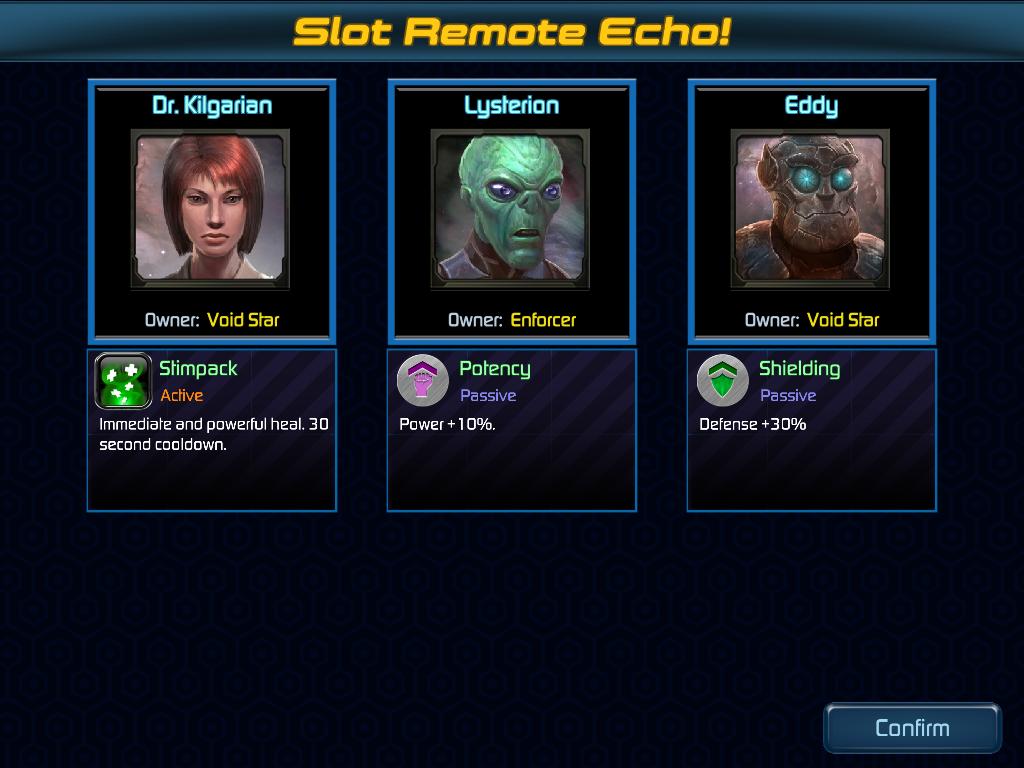 Echo 提供的技能將顯示在畫面邊緣一樣只要直接點擊就可使用,使用時沒有魔力限制,但是有冷卻重新使用的等待時間,除此之外比較特別的是遊戲中也可以借用其他玩家的 Echo,這裡除了使用線上好友名單內好友的 Echo 外,系統也在每次重新進入戰場時提供三名隨機線上玩家的 Echo 讓我們選擇搭配。