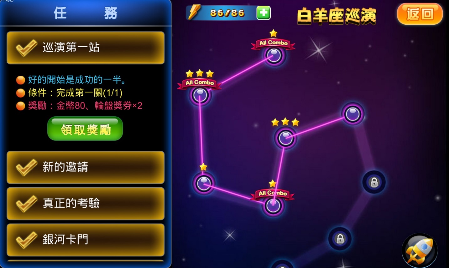 活動期間,登入遊戲,進入「巡演」任務,成功通過關卡,即可獲得獎勵,任務關卡獎勵主要為金幣,每5關還可以額外獲得「輪盤獎券」,使用後有機會加碼獲得鑽石和超值道具,想要展現高超的節奏感與一手的好舞技,快上線挑戰「巡演」吧!