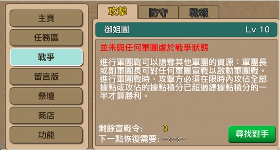 在軍團到達一定的等級之後,就可以開啟軍團戰爭,軍團長可以使用「宣戰令」向其他勢力軍團進行宣戰來搶奪資源。在進行軍團戰時,戰場共區分為十個據點,軍團長需要依照團員的屬性及戰鬥能力,來配置在不同的攻守崗位進行攻守,正所謂「兵法陣中變、奇謀局外生」,軍團戰能否百戰百勝,就要看玩家們的兵法謀略的功力了!