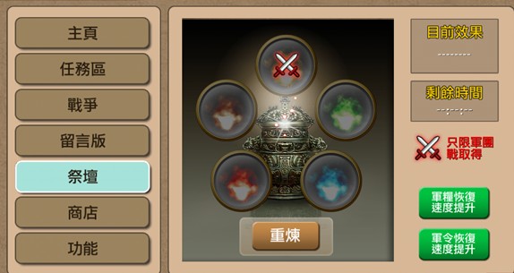 在軍團系統中,執行軍團任務及軍團戰獲勝搶奪來的資源集齊五個元素後,就可以前往祭壇啟動Buff功能,全軍團員的軍糧或軍令就可達到加成的效果。