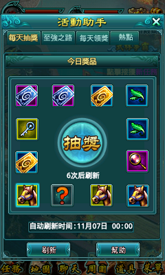 玩家只要更新至「大話西遊」版本後,點選左上角的活動標示,就可以進入抽獎介面。玩家每天都可以進行兩次免費抽獎,免費次數使用完畢之後,就只能透過付費進行抽獎,每執行 6 次抽獎後獎項即會刷新,系統會隨機配置各種獎項讓玩家抽取,包含了各式各樣的稀有合成材料與裝備,若不滿意系統配置的獎項的話,可透過「刷新」更新獎項,說不定會出現異想不到的大禮呢!