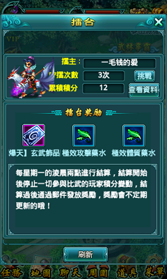 以往要在擂台與其他玩家切磋需要付一筆費用才能夠進行,然而這樣卻削減了玩家間爭鬥 PK 的樂趣,畢竟並不是所有玩家都有能力付一筆費用。官方聽到了玩家們的心聲,全面調整比武擂台規則,現在玩家隨時隨地都可以進行挑戰,並且持續累積積分,每週系統會計算排行榜上的排名派送獎勵,快來爭奪你的武林至尊以及各項珍寶吧!