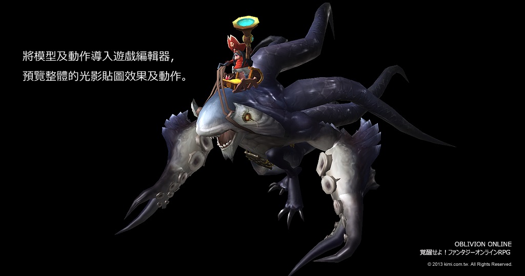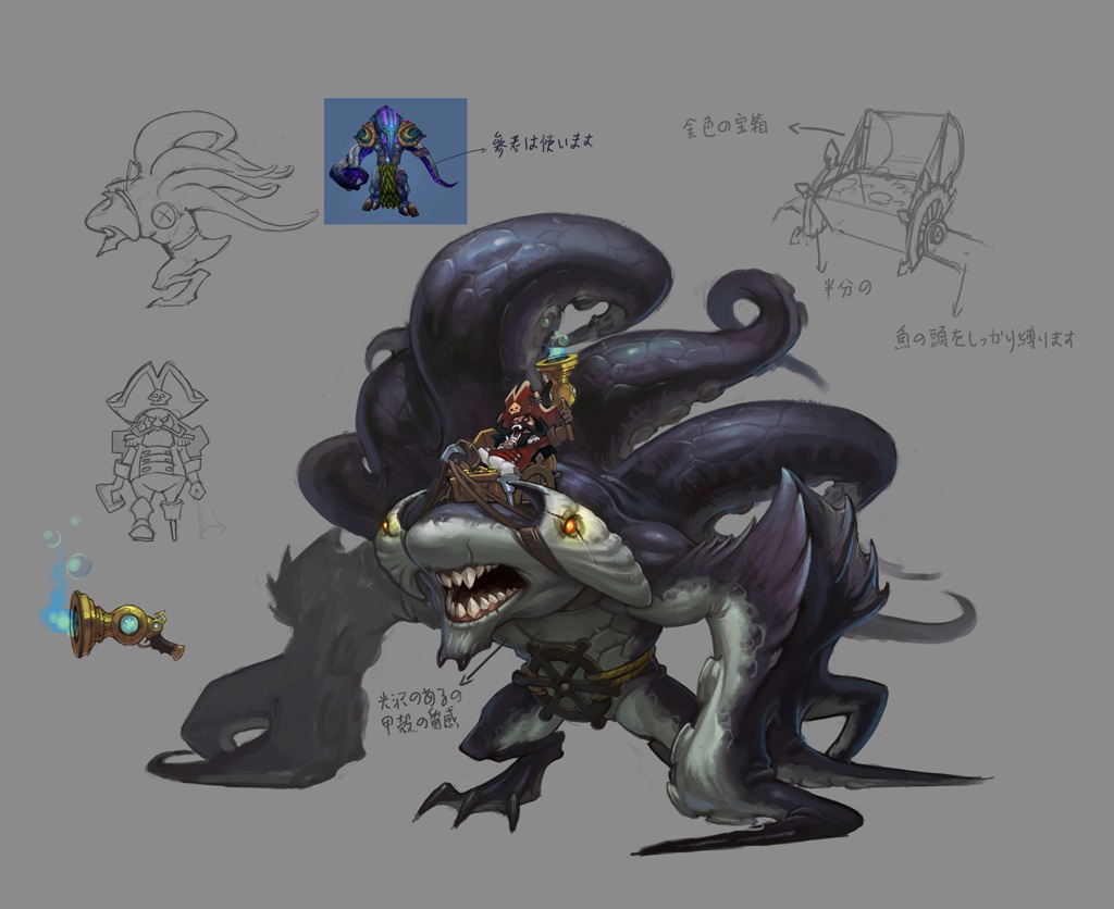 怪物在設計上,分為兩個部份,海盜 BOSS 及受其操控的人形大白鯊坐騎。海盜 BOSS 跟印象中的鐵勾義肢木腿造型大致吻合。大白鯊坐騎主要是以雙髻鮫的頭部,混合大章魚的觸角,比例也是人類角色的 3 到 4 倍,以具大的身軀及獨特的外型,成為遊戲初期最具魅力的角色。