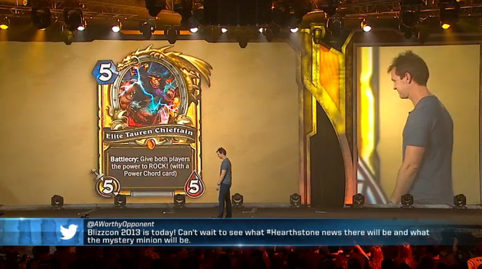 《爐石戰記》則是曝光了專為 BlizzCon 盛會所設計的金卡!這張卡牌有著獨特的搖滾特效,不僅在放置於場中時能夠有著華麗的登場效果,此外攻擊時也會有吉他彈奏的特效。