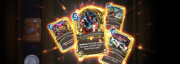此外,「精英牛頭大佬」出場時還將會給雙方玩家隨機一張「強力和弦」卡牌,分別是「盜賊愛從...」、「我是魚人」、「部落之力」。每張強力和弦卡牌都跟精英牛頭大佬一樣是金卡,還有特別的卡牌動畫。官方表示,若無法參加 BlizzCon 或是利用虛擬門票觀賞活動的玩家,未來也可以利用魔塵來合成非金卡版本的精英牛頭大佬。