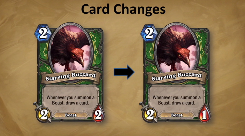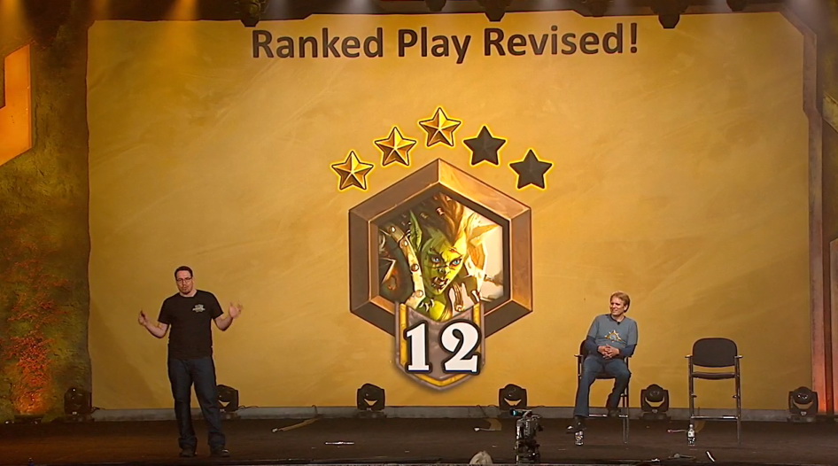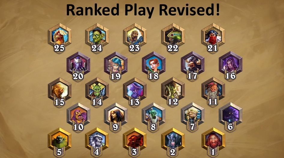爐石戰記:魔獸英雄傳》也預計針對數張卡片進行數值調整,而排名模式的對戰也將進行更動。每一個月,所有玩家等級將會重置為等級 25「憤怒雞」,玩家之間的對戰將會配對到等級相近的玩家。每贏一場遊戲就會得到一顆星,獲得足夠的星即可提升等級,連續勝利將有可能獲得額外的星。在較高的等級時,如果你輸掉一場遊戲就會掉一顆星,除了等級 1,它是一個特別的等級:傳奇。此外,每一個等級有著自己的圖像與獎章。