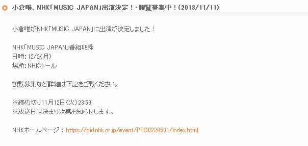昨(11)日 小倉唯官方網站宣布,將募集觀眾參加於 12 月 2 日在 NHK 頻道播出的音樂節目 MUSIC JAPAN。屆時同台演出的將有 中川翔子、HKT48、NMB48、BENI、LUHICA 等眾多歌手。