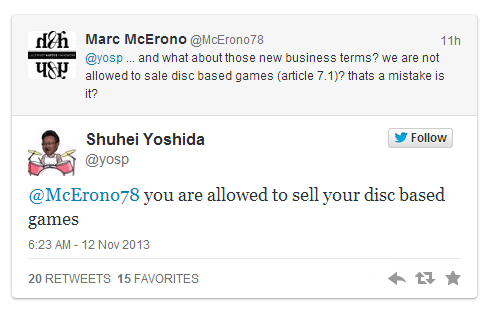 上述條款與 SCE 長期以來對於 PS4 二手遊戲市場所採取的開放態度有些差異。官方目前尚未針對該議題有所回應。更新:SCE 全球工作室總裁吉田修平今(12)日上午在 Twitter 上表明 SCE 將允許玩家出售光碟套裝遊戲。