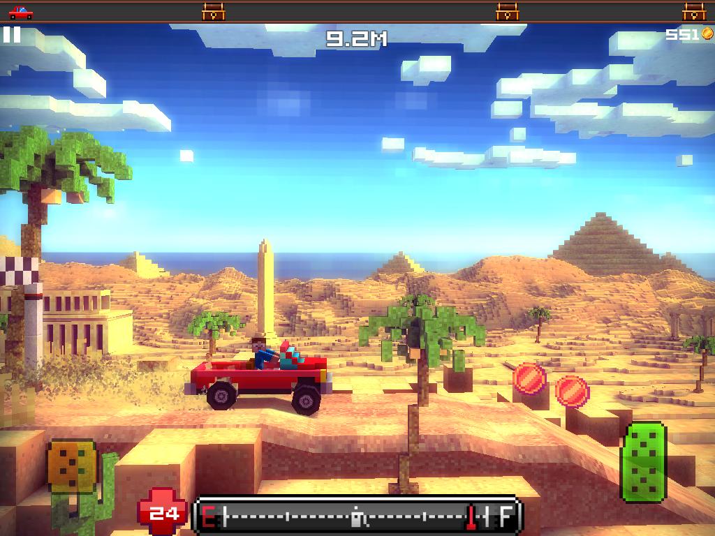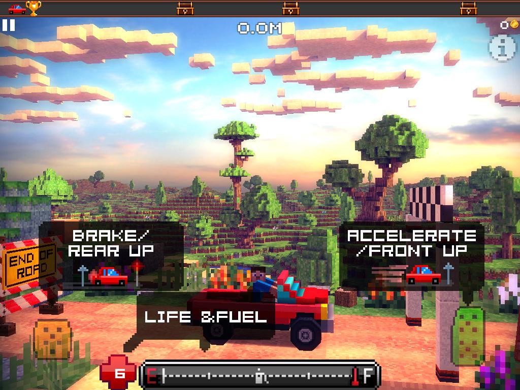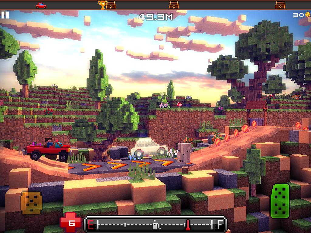 Blocky Roads》中就比較沒這種問題,賽道設計流暢而一氣呵成,難度也不至於苛求玩家,即使玩家不能一次完成賽程也可以保留戰利品,那麼下次升級後就能順利的飛越原本不能闖過的路段。