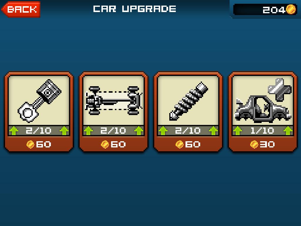 畫面正下方是汽車的耗油量,玩家要一邊控制損耗,然後前進尋找中途補給的油罐以免熄火。又遊戲一路上散落著金幣,玩家可以在往前推進時順道收集,金幣可以用來購買新車、打開更多的關卡場景,或著用以增強車體部件,使玩家的座車更加穩定、快速。