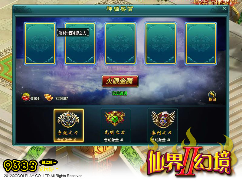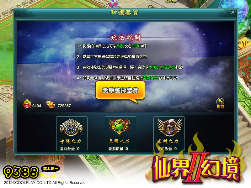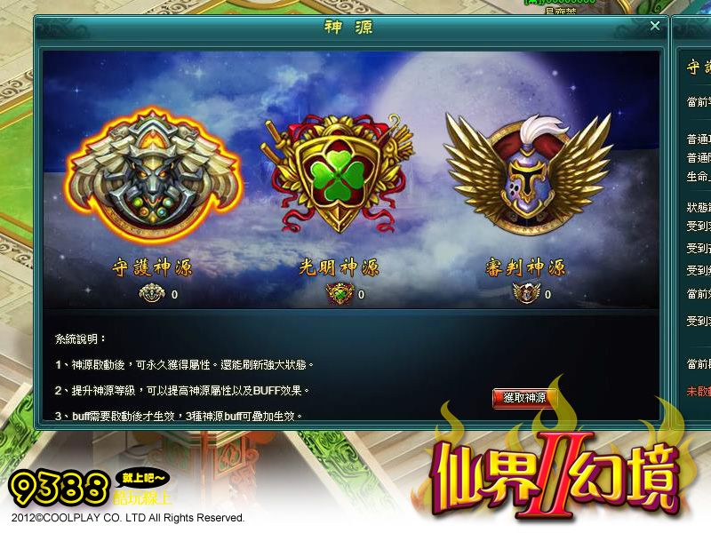 「守護神源」會自動被啟動,但「光明神源」需要元寶或足夠的「光明之力」來啟動、「審判神源」則需要元寶或足夠的「審判之力」來啟動。而神源之力的獲取方式相當簡單,只要進入神源系統介面並點擊「獲取神源」,即可進入神源鑑賞界面,玩家需要選擇下方對應的神源之力按鈕,接著會發出5張牌中請任選1張,將可獲取相應的神源之力。