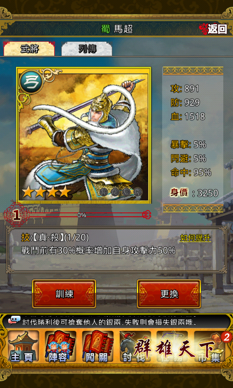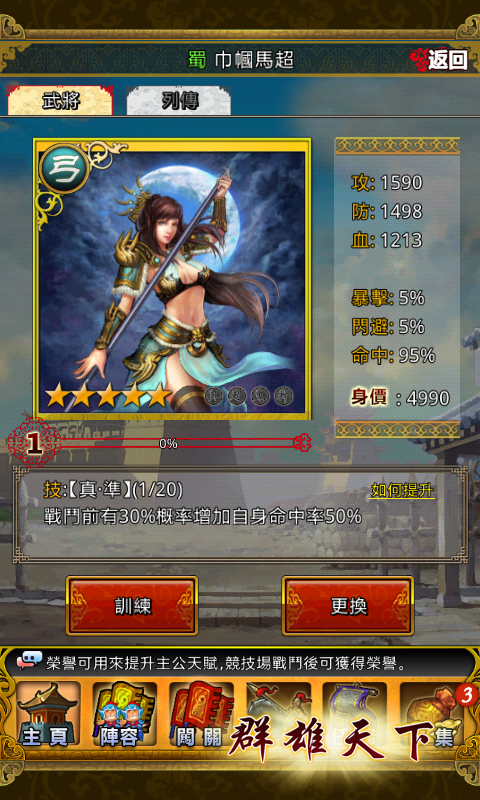 五虎將馬超變為巾幗馬超,西涼特有的長弓騎射,讓巾幗馬超的弓手技能更上一籌,特技為「真‧準」能在瞬間提高自身的命中率高達 50%,讓攻擊彈無虛發。