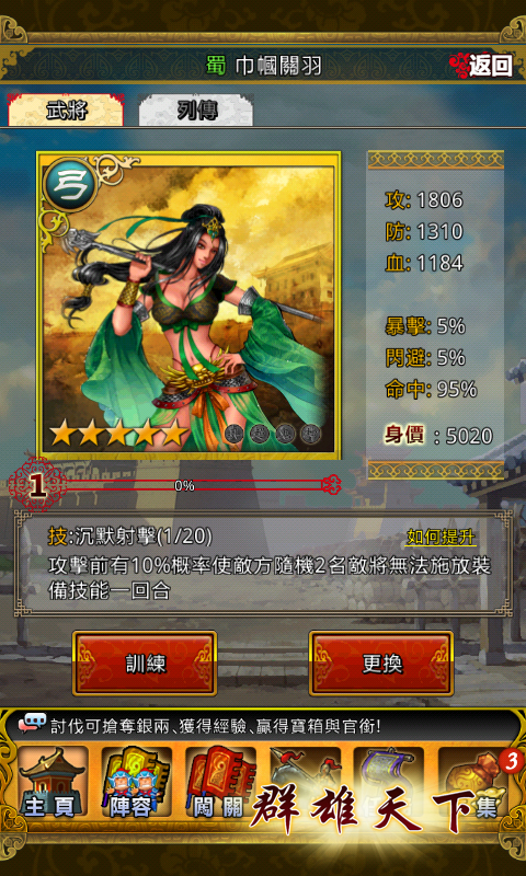 武聖關羽化身為巾幗關羽,絕佳的攻擊力再搭配特技「沉默射擊」,是部隊中不可或缺的輸出戰力。