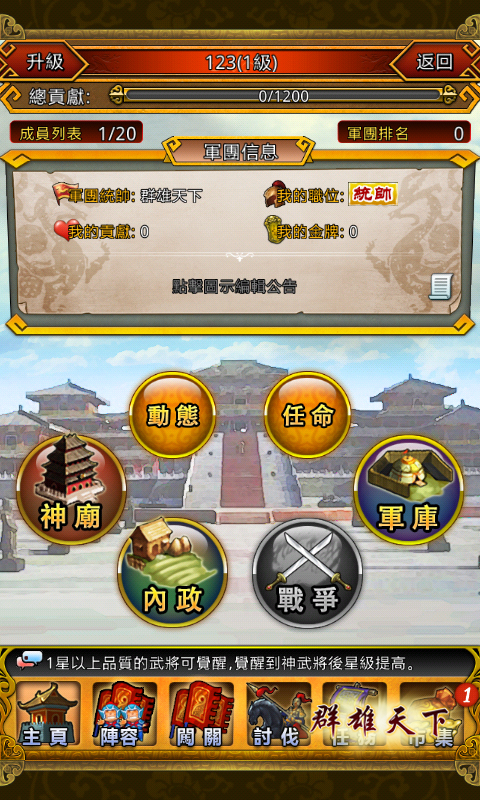 本次改版除了女武將之外,讓玩家引頸期待的全新功能,是強調大規模 PvP 戰鬥的軍團戰,讓玩家可以享受與戰友齊聚為了軍團的榮耀共同奮戰,目前的資料顯示,軍團功能除了對抗之外,團長可以任命團員為不同官職,軍庫進行獎勵分配,內政來拓展軍團勢力。