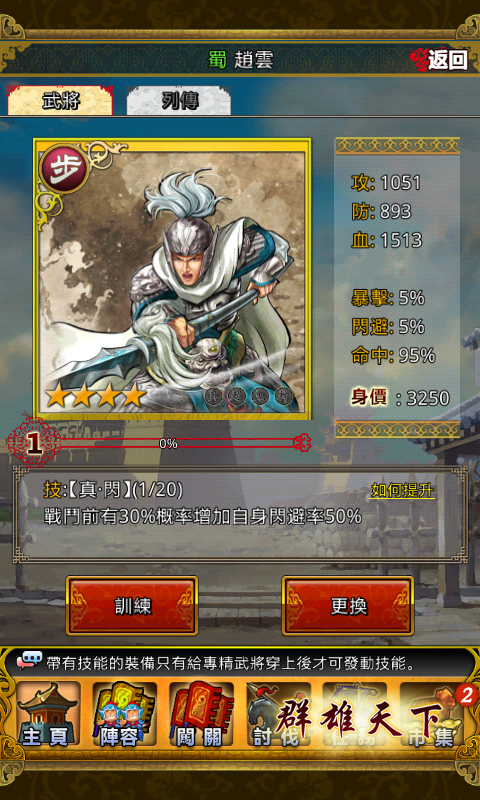 常勝將軍趙雲的女角為巾幗趙雲,特技為「援護」,可替附近隊友抵擋一次傷害,可謂是七進七出,忠心護主的一代名將。