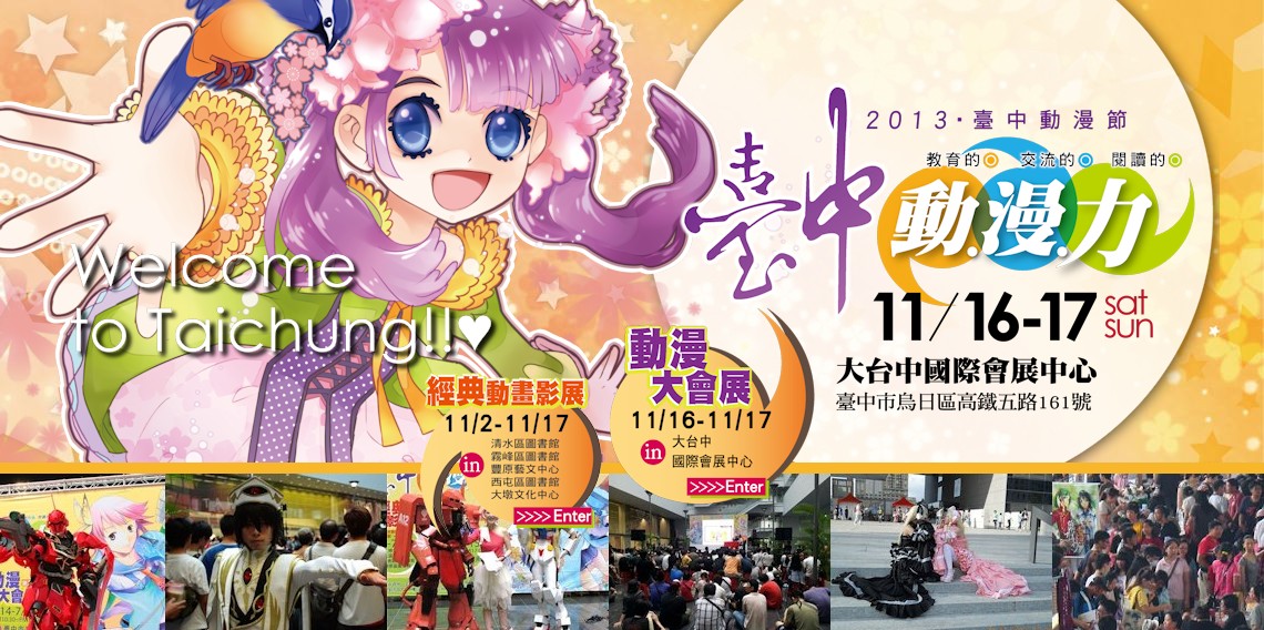 「2013 臺中動‧漫‧力」活動將自 11 月 16、17 日兩天的上午 10 點半至下午 5 點,活動會場位於大台中國際會展中心(臺中市烏日區高鐵五路 161 號),可搭高鐵或臺鐵到達會場,另外市區可搭乘 159、160、161 三線高鐵臺中站快捷公車,更多關於活動的詳細資訊可前往官網查詢。