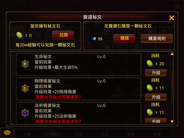 新版本中,玩家達到一定等級後可以用經驗兌換秘文石,用來換取HP、各種屬性傷害,大幅提升玩家的生存能力。用秘文提升屬性需要按照一定的次序,不同等級階段開放提升的空間不同。