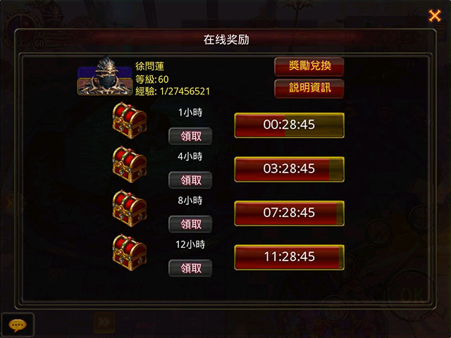25級:經驗×60000、1級寶石箱x1、藍色寵物寶箱x1、藍裝寶箱x1、強化打折卡x2、30級禮包x1;
