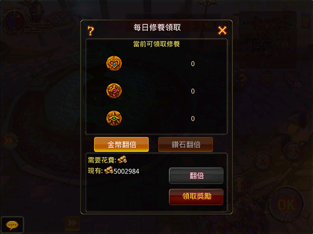 介面右上角的按鈕點開後會看到5個功能圖標,從左至右分別是:在線獎勵、每日修養領取、排行榜、普通訓練、挖掘藏寶圖。