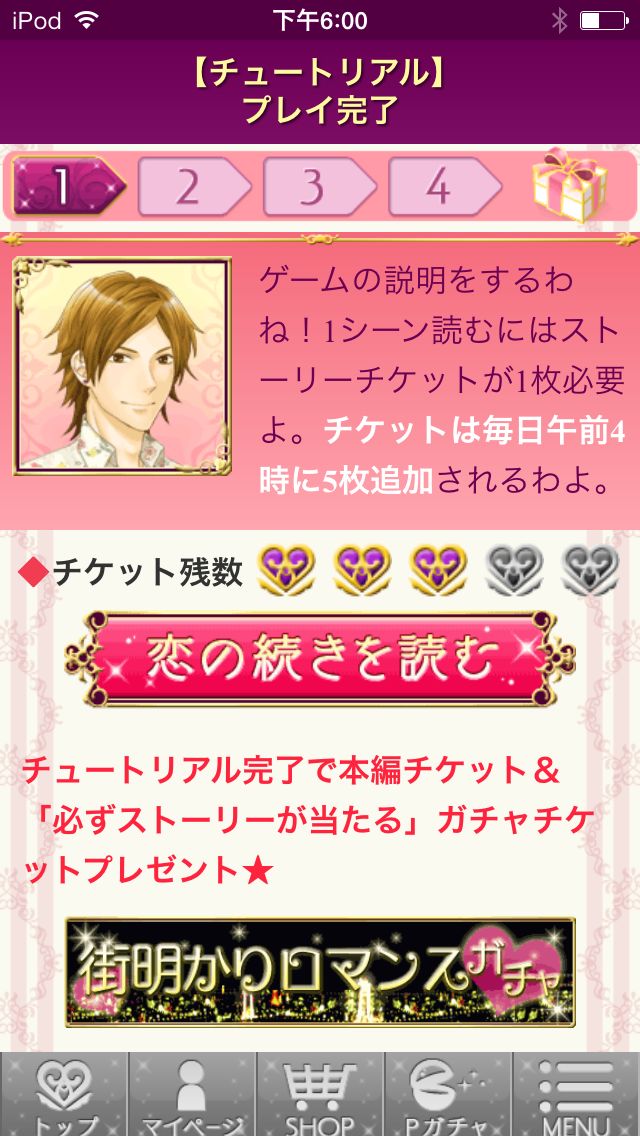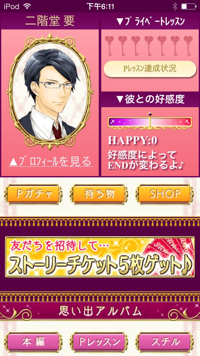 遊戲開始時,會先要求玩家決定女主角的姓名,並且進入序章。待故事結束後,玩家即可選擇想要進行攻略的角色。每個角色、每個章節的故事都有 5 至 10 個小節不等的長度,而進行一個小節需要耗費玩家一章「故事門票」-這個門票可以課金購買,也可以等待每天自動補充恢復。在主畫面下方「マイページ(我的頁面)」中,就可看到玩家目前持有的「故事門票」數量。