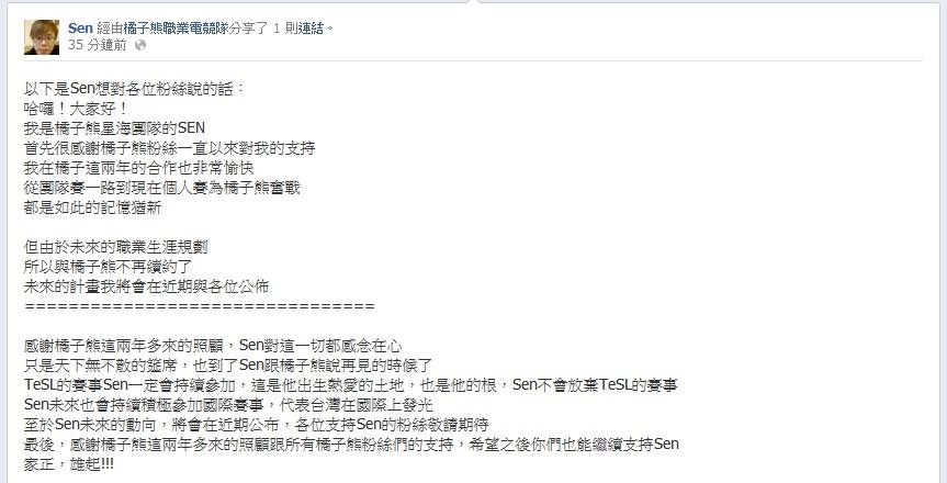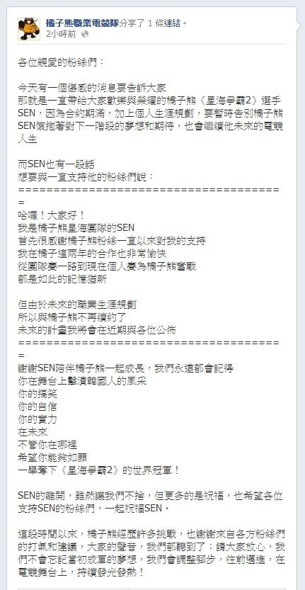 星海爭霸 2》蟲族選手 Sen 於今日正式確定將離開橘子熊職業戰隊,橘子熊稍早於官方公告,橘子熊《
