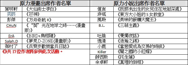 首先於本日開始報名的活動為「HAPPY BIRTHDAY!FORCE原力誌 1 週年慶生會!」,將邀請 17 位「FORCE 原力誌」的漫畫及小說作家,及 55 位讀者一同於 12 月 21 日(六)台北光點 2F 歡樂過生日。