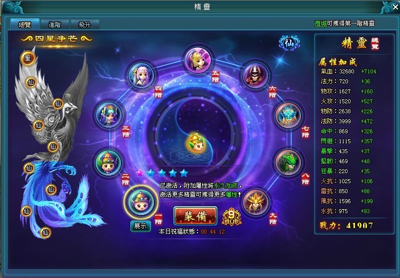 精靈飛升:每一階精靈都有固定的星孔,飛升時消耗道具刷新星孔的屬性,讓精靈可以獲得更多的屬性。每次飛升將會消耗一定數量的乾坤石,並隨即獲得一枚屬性星星。當精靈的星星都是相同顏色時,精靈的品質將會發生提升,獲得百分比的屬性獎勵。