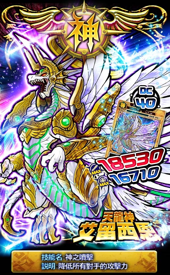 在新上市的神轉蛋機中,將會放入上週於鉑金轉蛋機中所加入的全新神卡「天龍神艾留西恩」,此卡的技能為「神之噴擊」,可降低場上所有對手的攻擊力,影響力十分巨大。且本卡片為神卡系列中第一隻的龍角色,喜愛龍角色的玩家趕快把他納入隊伍吧!