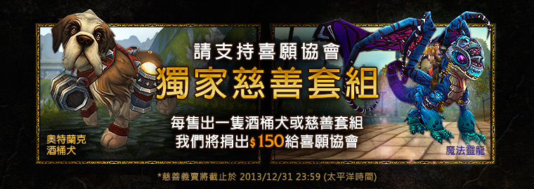 Blizzard 為助病童圓夢,於即日起至 12 月 31 日止(太平洋時間)推出《魔獸世界》年度慈善虛寵「奧特蘭克酒桶犬」與慈善套組:「奧特蘭克酒桶犬」搭配飛行坐騎「魔法靈龍」。值得注意的是,以往的慈善捐款都是捐到美國,而這次則是首次捐出 150 元的銷售金額給中華民國喜願協會「喜願協會 Make-A-Wish」。