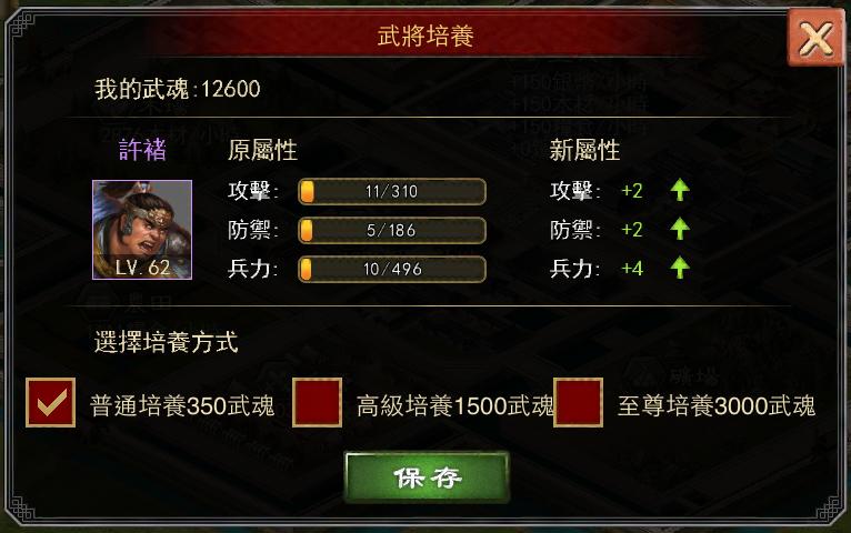 淘汰的已培養武將可以使用清空屬性來返還部分武魂。進行屬性培養後,培養值會顯示在介面中,此時可以選擇是否保存該次培養。當然,如果屬性不好,玩家可自行全部取消,根據武將等級不同,培養槽上限也會發生變化。