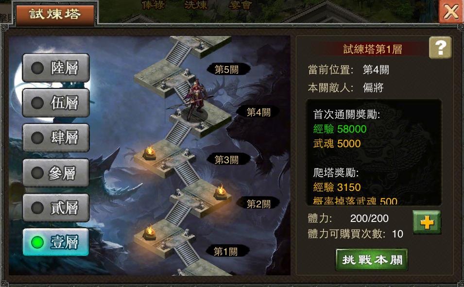 三國志一統天下》全新推出的「試煉塔」是玩家驗證自身實力最好的地方,玩家只要透過不斷的自我強化,挑戰自我極限,就可登上試煉塔頂!玩家只要角色達53級即可挑戰!試煉塔總共分為六層,每層有25關,每5關可挑戰一個BOSS,通過每層全部關卡,可開啟更高一層挑戰,高度越高,難度會越來越大,獎勵也會越來越豐厚。但試練塔對玩家的實力要求非常嚴格,是難度最大的副本戰鬥。