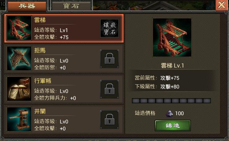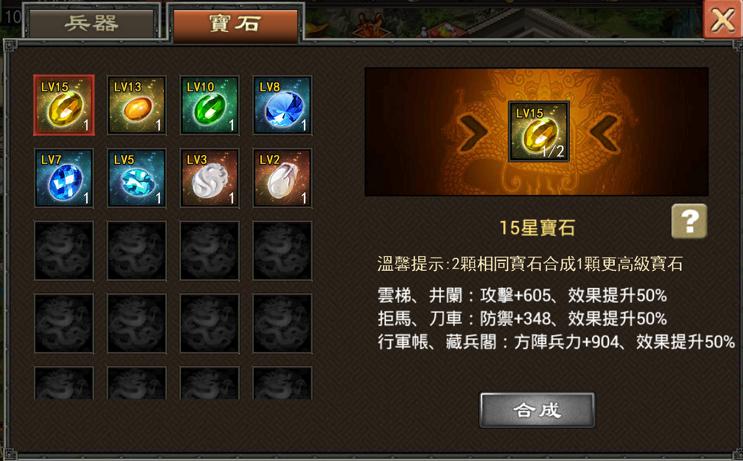 想讓武將出人頭地嗎?想在國戰中完勝對手嗎?想在競技場上獨佔鰲頭嗎?只要為兵器嵌上寶石就能讓戰鬥力實現飛躍!全新的「寶石系統」可提升玩家兵器的「攻擊力、防禦力、帶兵數」等屬性,玩家到達74級,研究相應的科技後,即可解鎖兵器寶石槽、並且可以對寶石進行鑲嵌、合成等操作,玩家只要將寶石鑲嵌在已解鎖的6件兵器上,寶石會按不同百分比來增加每一件兵器的固有數值。