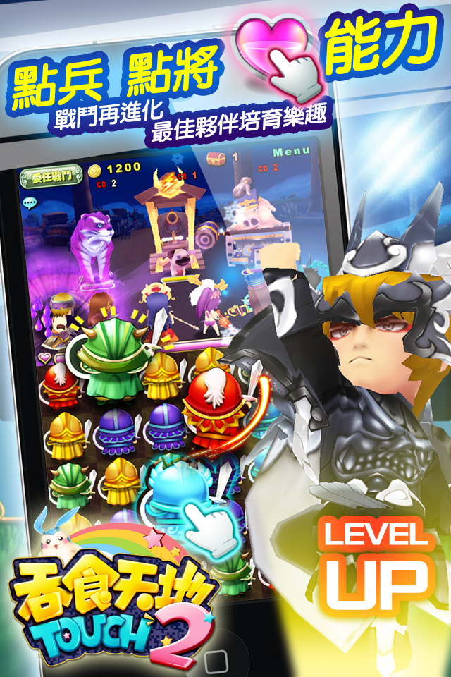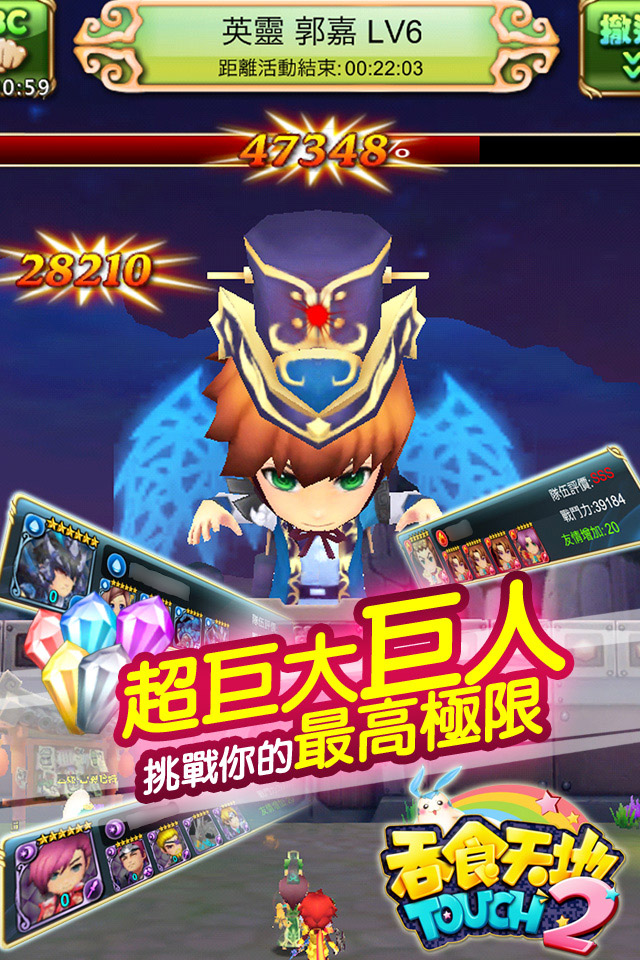吞食天地 TOUCH 2》樂趣滿載的多元玩法,研發團隊特別加入巨人化猛將挑戰活動,要考驗玩家們的實力!在每天中午 12 點及晚上 8 點兩個時段,強悍的巨人 BOSS 將會出現在遊戲中等玩家前來挑戰,玩家必須齊心合力擊倒巨人化的 BOSS,才能有機會拿到暗藏在 BOSS 身上的珍稀虛寶和大量名聲、金錢!